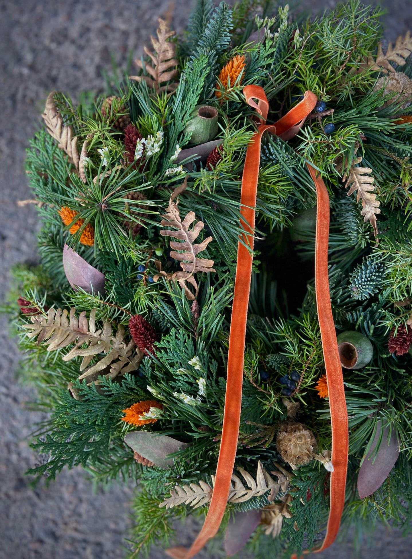 Erilaisista havuista sidottu kranssi, halkaisija 35 cm, soveltuu parhaiten haudalle tai rivi- / omakotitalon oveen. Koristeltu kauden kuivatuilla materiaaleilla ja viimeistelty nauhalla.