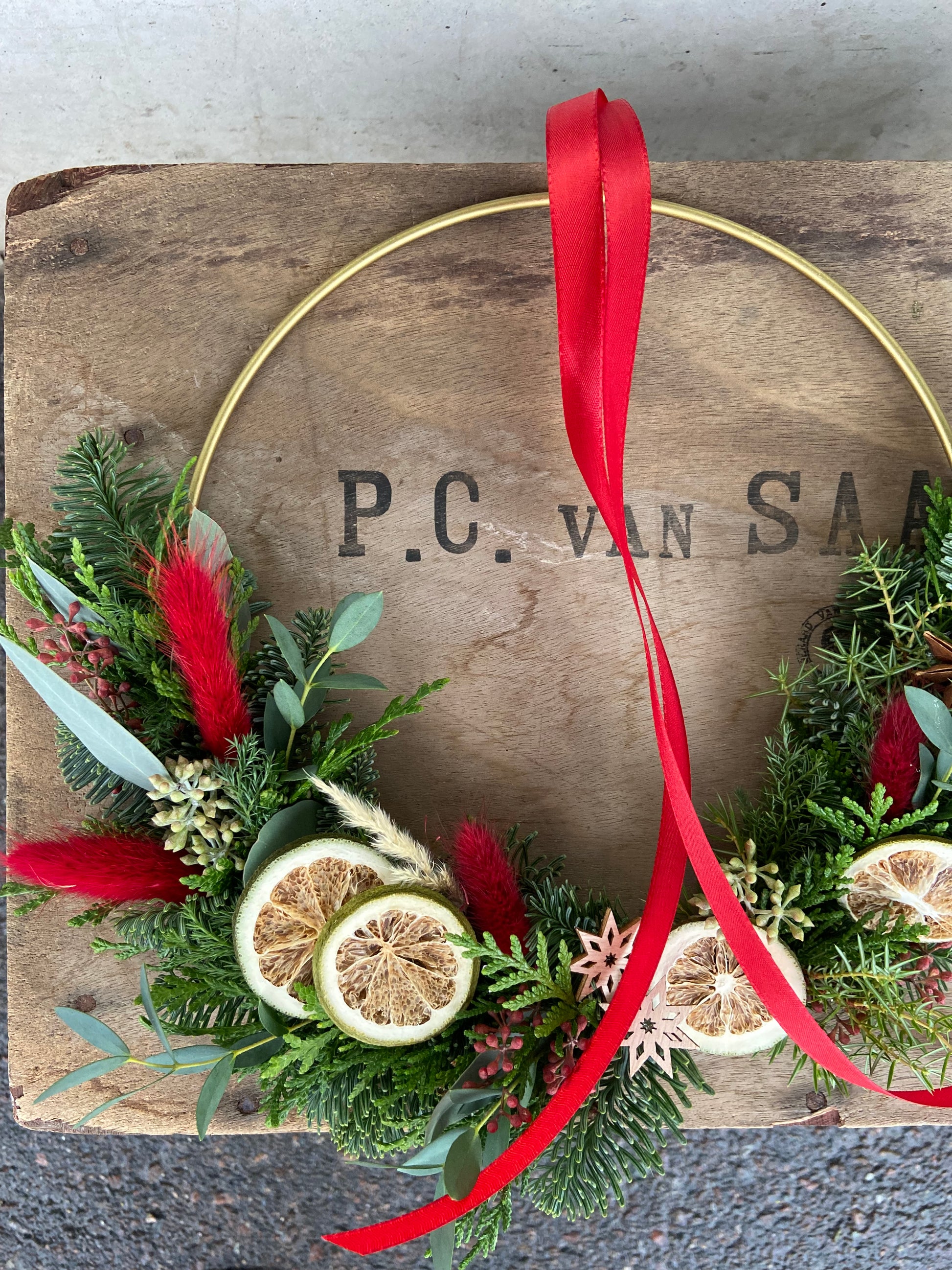 Puoliksi kukitettu kranssi jouluisissa sävyissä halkaisija 25 cm, soveltuu esim. ulko-oveen tai sisätiloihin. Materiaalit vaihtelevat mutta tunnelma on esimerkki kuvan mukainen.
